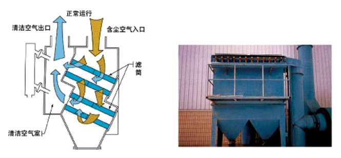 當濾筒表明捕集的粉塵達到一定數量時(shí),濾筒的過(guò)濾阻力也隨之達到某一定值時(shí),控制閥將自動(dòng)打開(kāi),壓力空氣直接沖入濾筒中心,把捕集在濾筒表面的粉塵吹凈,粉塵在重力的作用下,隨著(zhù)氣流下沉集塵斗中。。
